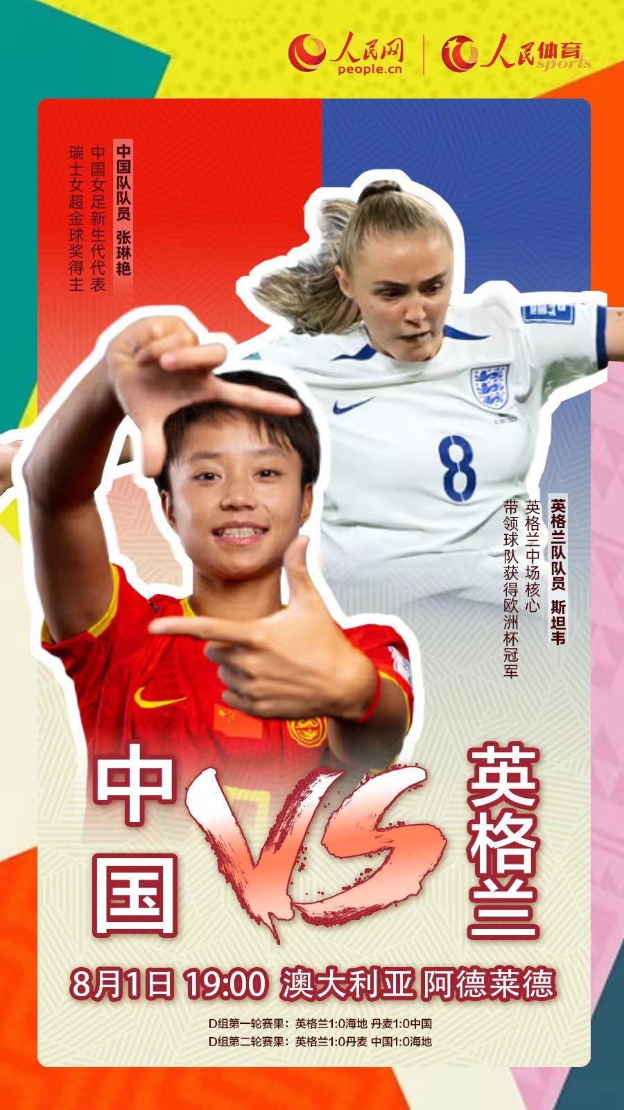 人民网北京8月1日电 (记者李乃妍)北京时间8月1日19时,中国女足将迎来本届女足世界杯小组赛最后一个对手英格兰队。小组赛前两轮,中国队一胜一负积3分,排名D组第三。