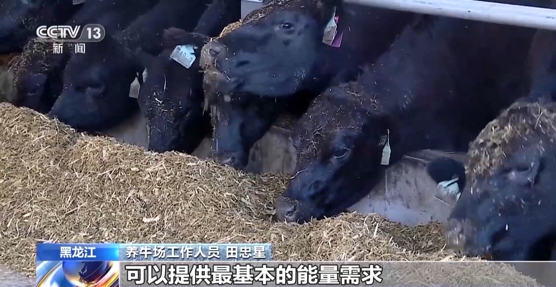 养牛场工作人员 田忠星:这个是我们给肉牛食用的粗饲料玉米秸秆,铡碎、揉丝、除尘之后,对于我们的肉牛来说,可以提供最基本的能量需求。