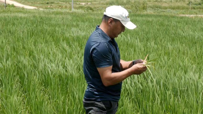 稻田里,种植大户毛厚威正在检查水稻的生长情况。今年,木梓乡曾毛村实施全域国土综合整治后,毛厚威将村里167亩的土地承包下来,尝试种植香稻。