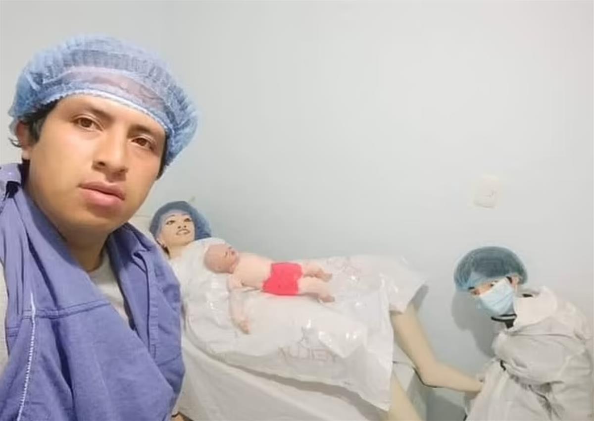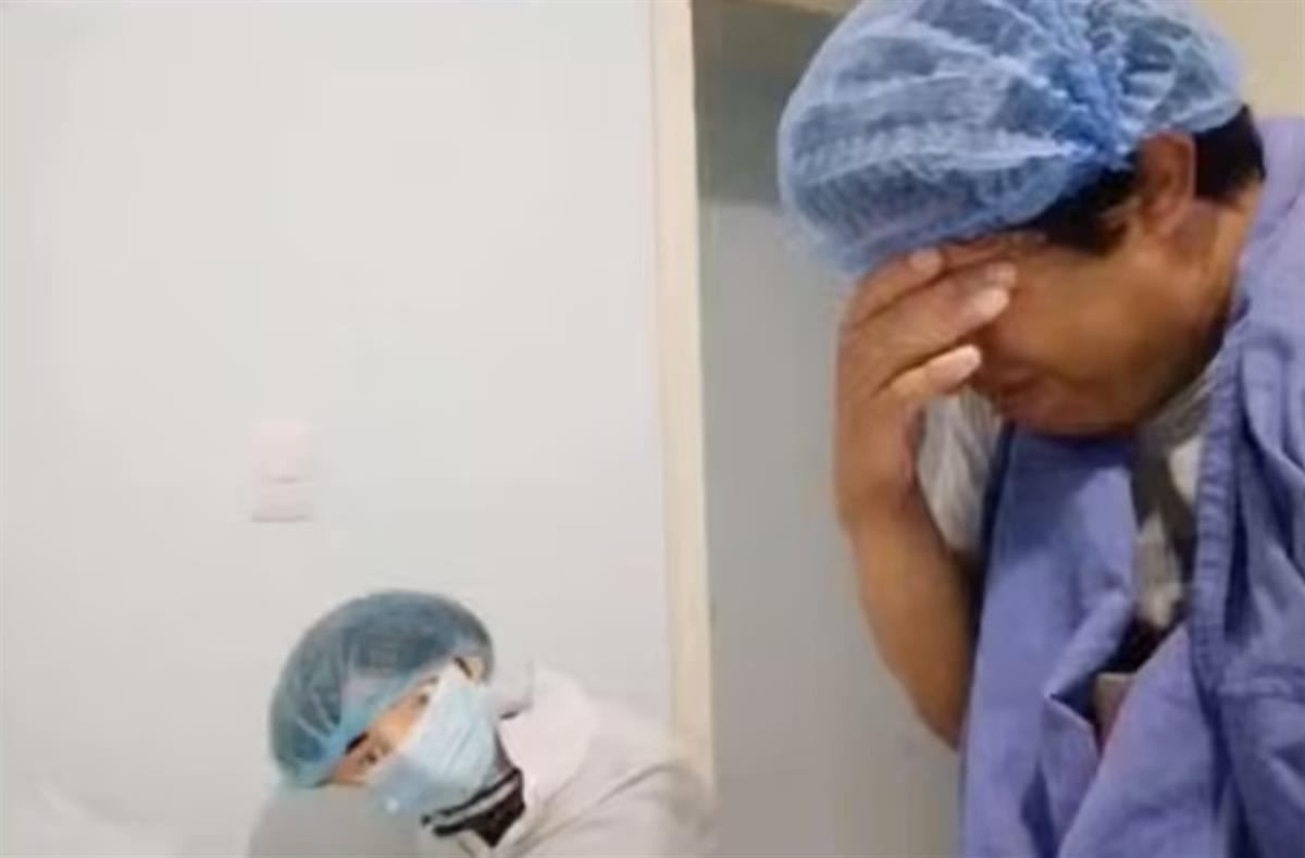 照片显示,娜塔莉亚穿着病号服躺在床上,另一只身穿白大褂、戴着口罩、医生打扮模样的布娃娃,正在照顾这位“妈妈”。“分娩”过程中,蒙特内格罗用手捂着脸,强忍着泪水。