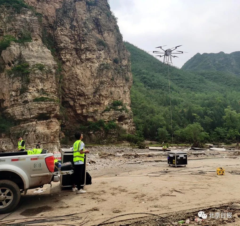 △4日,一架搭载北京移动应急通信系统的DG-M20系留式无人机在昌平区流村镇高崖口村迅速升空。