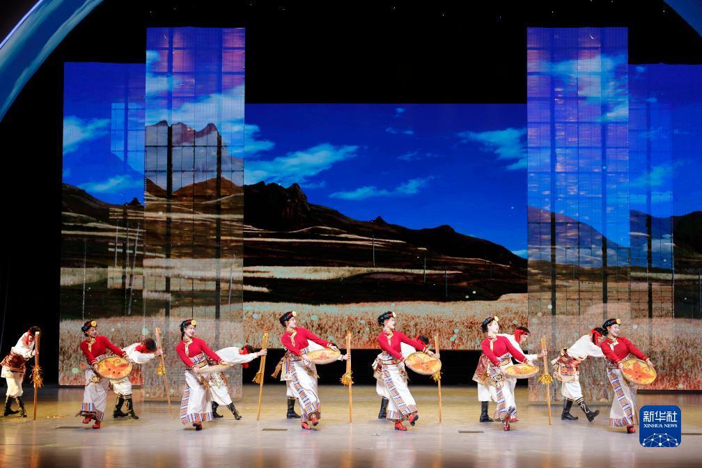 8月4日,来自阿坝师范学院的演员表演舞蹈《德基吉蓝》。新华社记者 沈伯韩 摄