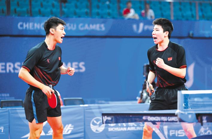 湖北日报成都8月4日电 (记者童军鹏)开局0比2落后,之后奋起直追以4比3逆转日本组合夺冠——8月4日下午,由湖北选手薛飞和队友徐瑛彬搭档的中国男双组合,在成都大运会乒乓球男双决赛中上演逆转夺金好戏,这也是薛飞收获的赛会第二金。