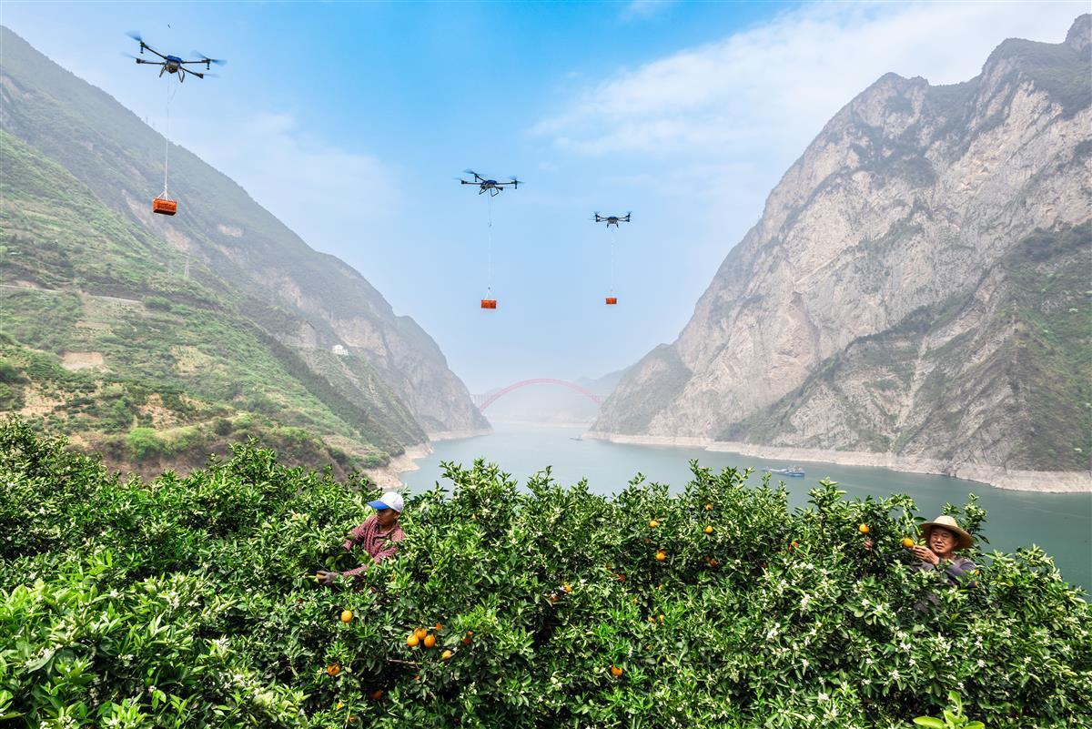 每到丰收时节,一箱箱金黄果实翻山越岭,飞跃山脊。橙果在空中、地面并驾齐驱、及时对接的运输场景,成为大山深处一道神奇的风景线。