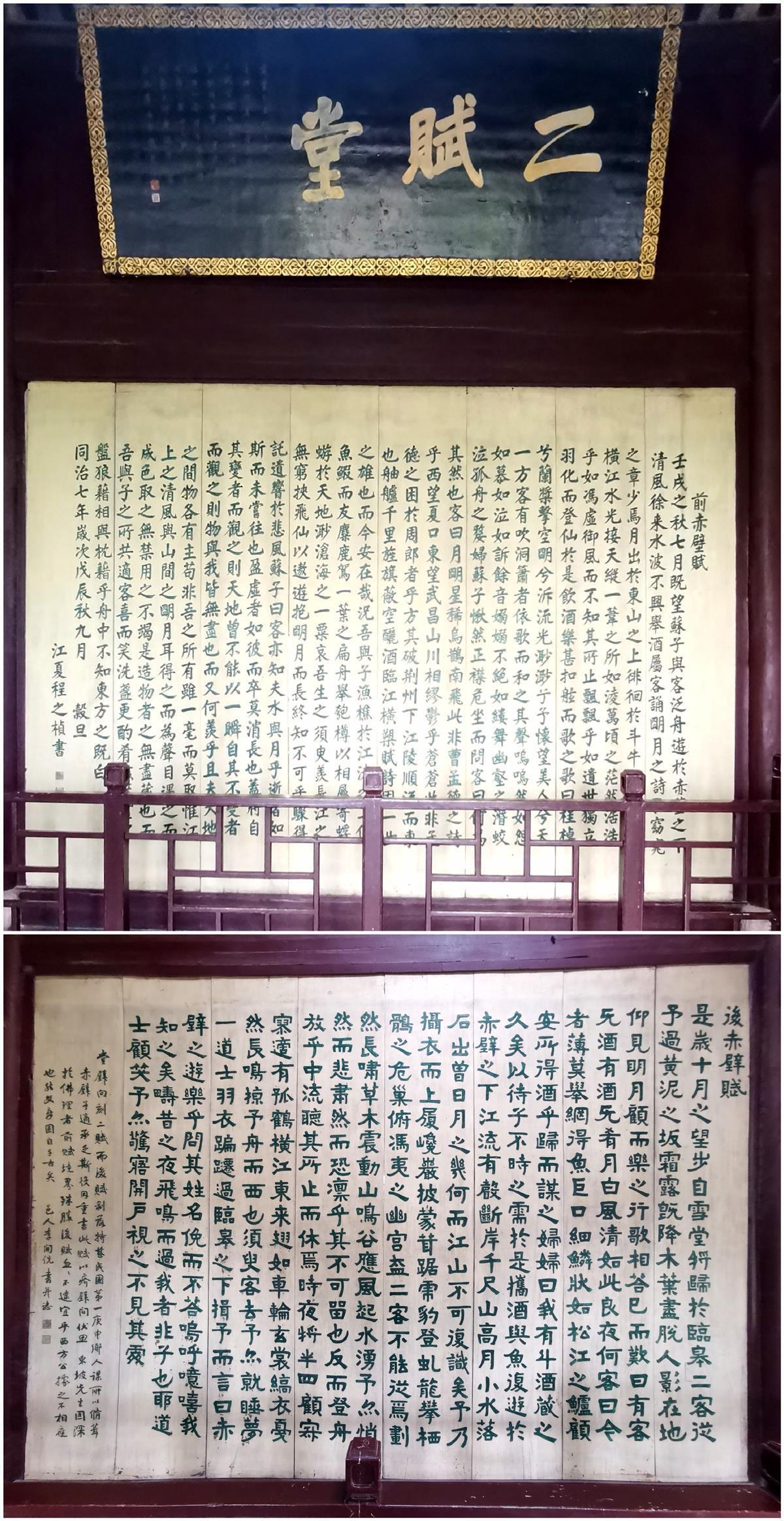 东坡赤壁几经修葺,集山水、亭台、祠宇、人物、题画、金石为一体。从环绕的山林间拾级而上,二赋堂、坡仙亭、快哉亭等古迹矗立其间,其中最显文脉绵延厚重的,当属囊括苏东坡72件书法作品的126块苏书石刻《景苏园帖》碑阁。