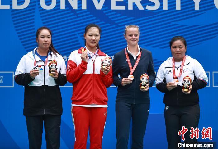 8月6日,成都大运会中国代表团旗手郭涵煜(左二)在网球项目女子单打比赛中夺得金牌。中新社记者 王磊 摄