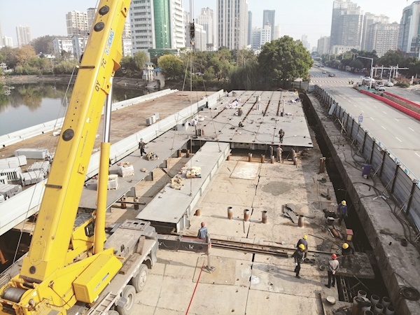 “经过专家反复研究论证,我们最终决定采用顶升横移的方案进行改造。”咸宁市政府投资项目建设管理局计划科科长肖强介绍道,这项新技术,是在丹桂桥上下游上各搭设一个钢平台作为拼装新桥和存放旧桥的临时平台,保留并加固下部结构,同时在钢平台上完成新桥面的预制,再顶起旧桥面,利用滑轨等设施移走旧桥面换上新桥面。