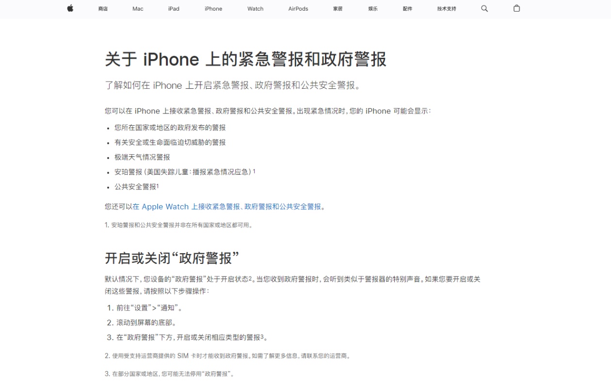 记者从苹果官网上发现,关于iPhone上的紧急警报和政府警报页面中介绍到,用户可在“通知”一栏底部开启“政府警报”,默认情况下,它处于开启状态,当用户所在国家或地区的政府发布警报,用户会听到类似于警报器的特别声音。不过记者在多部iPhone手机的“通知”一栏底部并未发现“政府警报”选项。