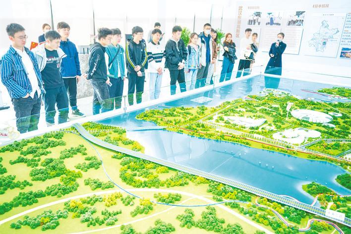 3月9日,大学生们参观湖北东湖科学城展厅,了解留汉工作就业情况。