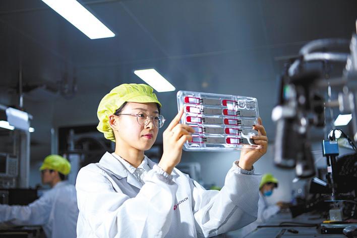5月24日,华工正源无线传送产品线开发部实验室,赵秋爽仔细检查光模块样品。