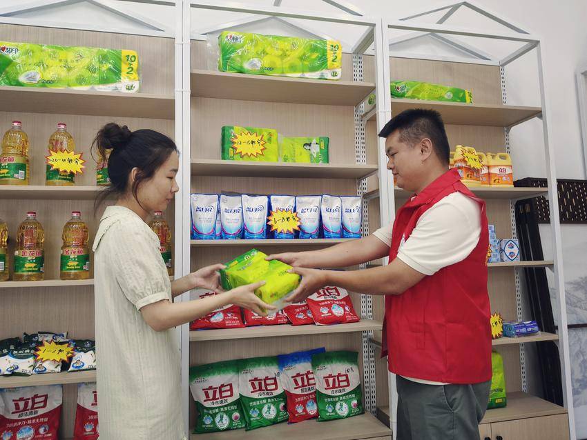 在城中街道新河社区,居民在”爱心超市”内兑换到积分商品