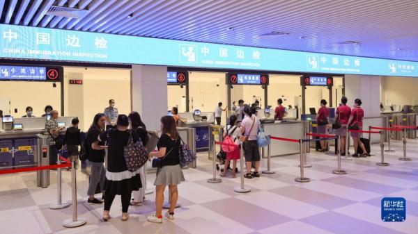 旅客在三亚凤凰国际机场国际航站楼有序通关(7月26日摄)。三亚凤凰国际机场国际航站楼改扩建项目主体工程已于7月1日完工并投入使用,该项目是海南自贸港首个主体工程完工并投入使用的封关运作项目。
