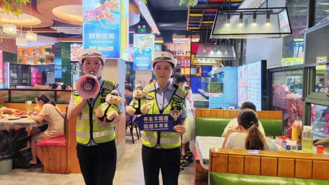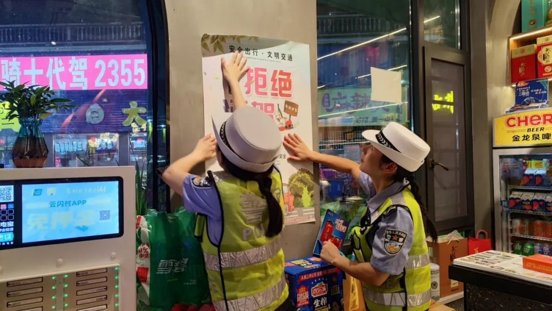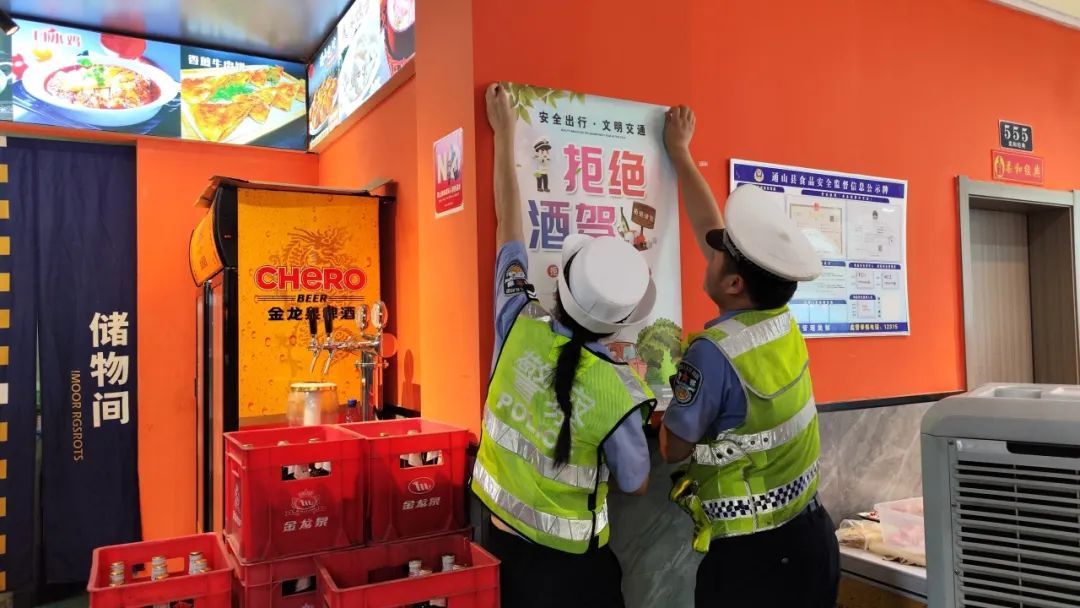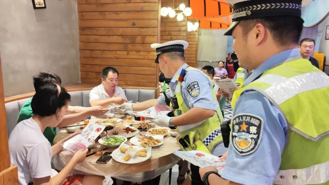 同时,民警将“喝酒不开车 开车不喝酒”提示牌和海报张贴在饭店醒目位置,并与酒店经营人员、服务人员深入交谈,教育引导大家积极参与禁止酒驾、醉驾的宣传教育工作中来,提醒前来聚餐的“食客”切勿饮酒驾驶。