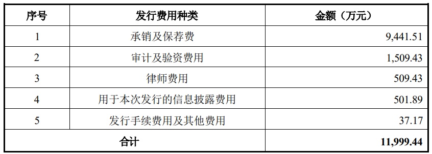 蓝箭电子本次发行的发行费用总额为11,999.44万元(发行费用均为不含增值税金额),其中承销及保荐费9,441.51万元。