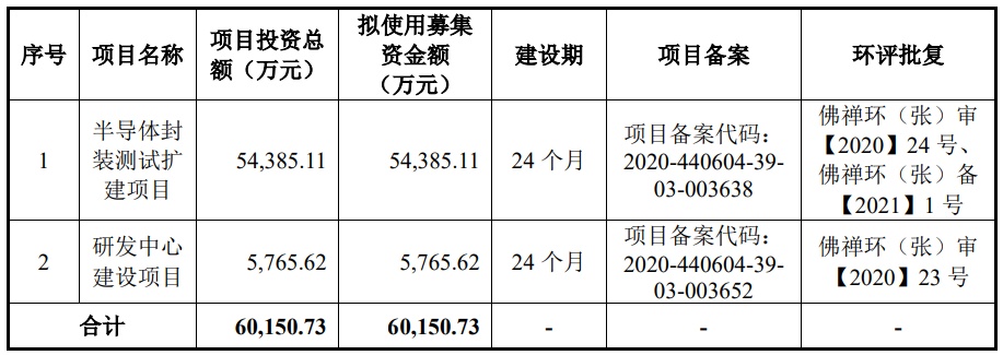 蓝箭电子2023年8月3日披露的招股说明书显示,公司拟募集资金60,150.73万元,用于半导体封装测试扩建项目、研发中心建设项目。