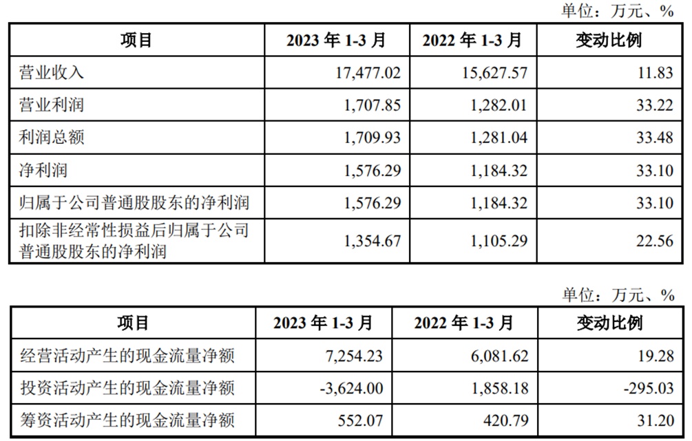 2023年1-3月,蓝箭电子实现营业收入17,477.02万元,同比增长11.83%;净利润/归属于公司普通股股东的净利润为1,576.29万元,同比增长33.10%,扣除非经常性损益后归属于公司普通股股东的净利润为1,354.67万元,同比增长22.56%;经营活动产生的现金流量净额为7,254.23万元,同比增长19.28%。