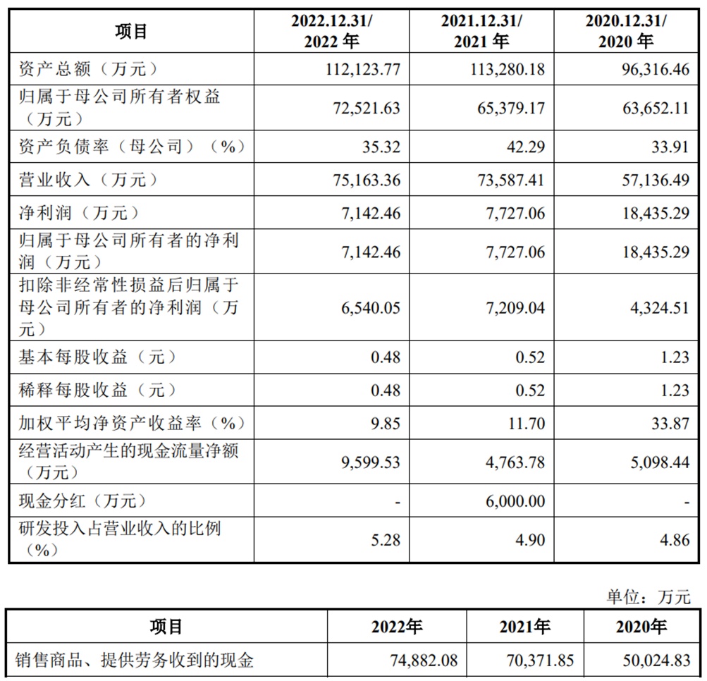 2020年至2022年,蓝箭电子的营业收入分别为57,136.49万元、73,587.41万元和75,163.36万元;净利润/归属于母公司所有者的净利润分别为18,435.29万元、7,727.06万元和7,142.46万元;扣除非经常性损益后归属于公司普通股股东的净利润分别为4,324.51万元、7,209.04万元和6,540.05万元。
