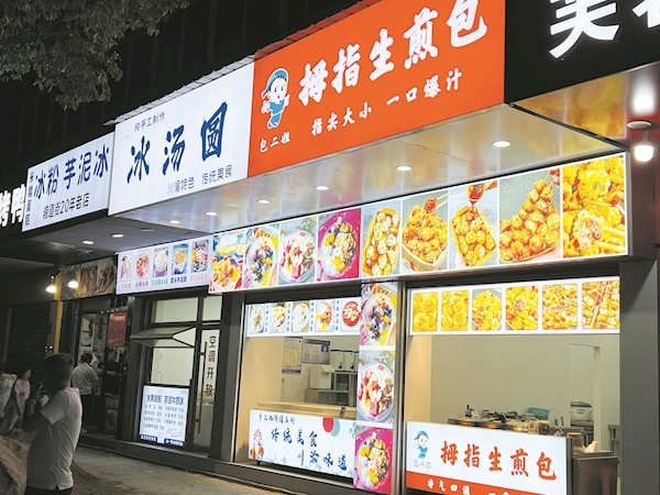 拇指生煎包、冰汤圆、口蘑虾滑、芋泥冰、手打柠檬茶是目前粮道街上开店数量最多的小吃品类。记者粗略统计发现,售卖拇指生煎包、冰汤圆、口蘑虾滑的门店在整条街上加起来有十多家。