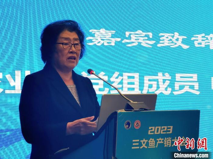 图为2023三文鱼产销大会现场,原农业部党组成员,中国农产品市场协会会长张玉香发言。祁增蓓摄