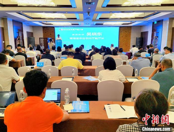 图为2023三文鱼产销大会现场,青海省农业农村厅副厅长吴晓东致辞。祁增蓓摄