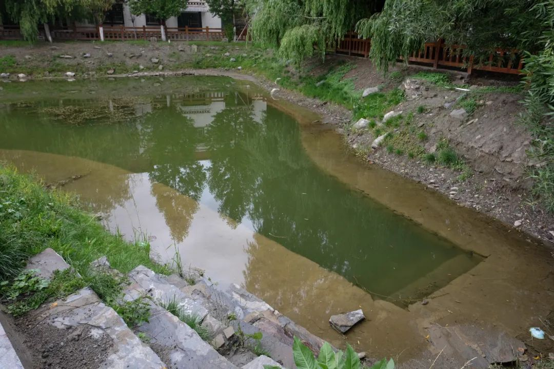 离五世达赖喇嘛旧居约250米远,有一潭清澈的池水,周围有茂密的杨树、卓玛树、青柳,垂柳倒映水中,没有一丝波澜。这就是传说中的奴玛神泉。