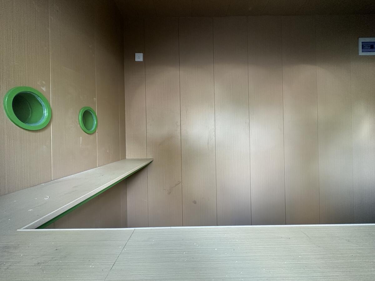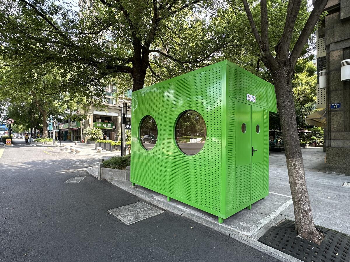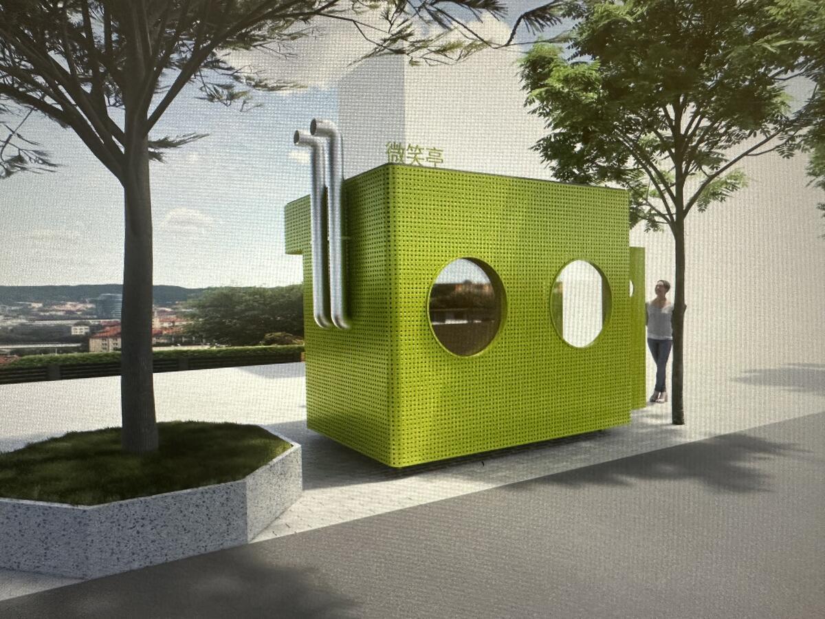 为什么会有这样的设计?刘伟坦言,这个亭子原先是核酸检测亭,现在它绿色的外观和旁侧的“烟囱”都是经原先核酸亭设计改造后呈现的。