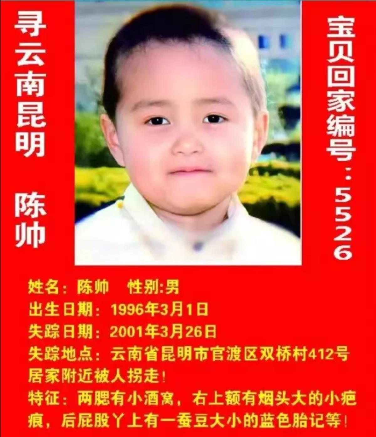 多年来,不管走到哪,陈育信总是随身带着一则寻人启事,写道:“陈帅,男,2001年3月26日(当时5岁)在云南昆明双桥村412号家附近被人拐带,右上额有一个烟头大小的伤疤,两腮有一对小酒窝。”