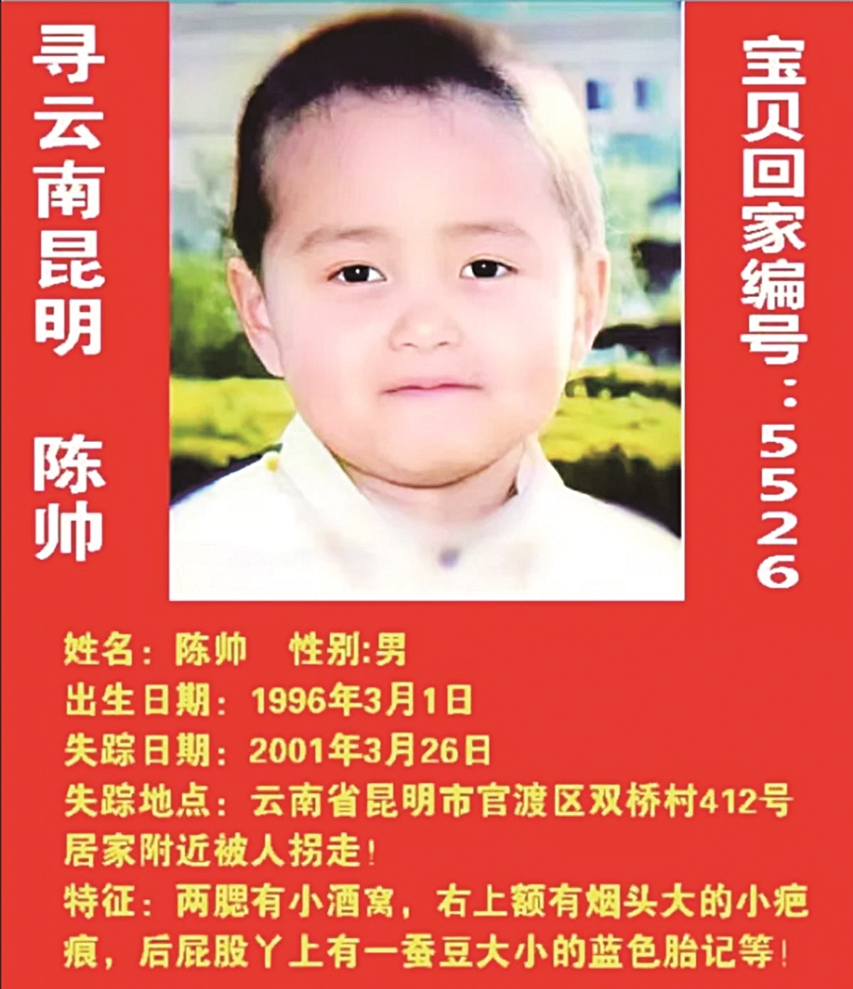 多年来,不管走到哪里,陈育信总是随身带着一则寻人启事,写道:“陈帅,男,2001年3月26日(当时5岁)在云南昆明双桥村412号家附近被人拐带,右上额有一个烟头大小的伤疤,两腮有一对小酒窝。”