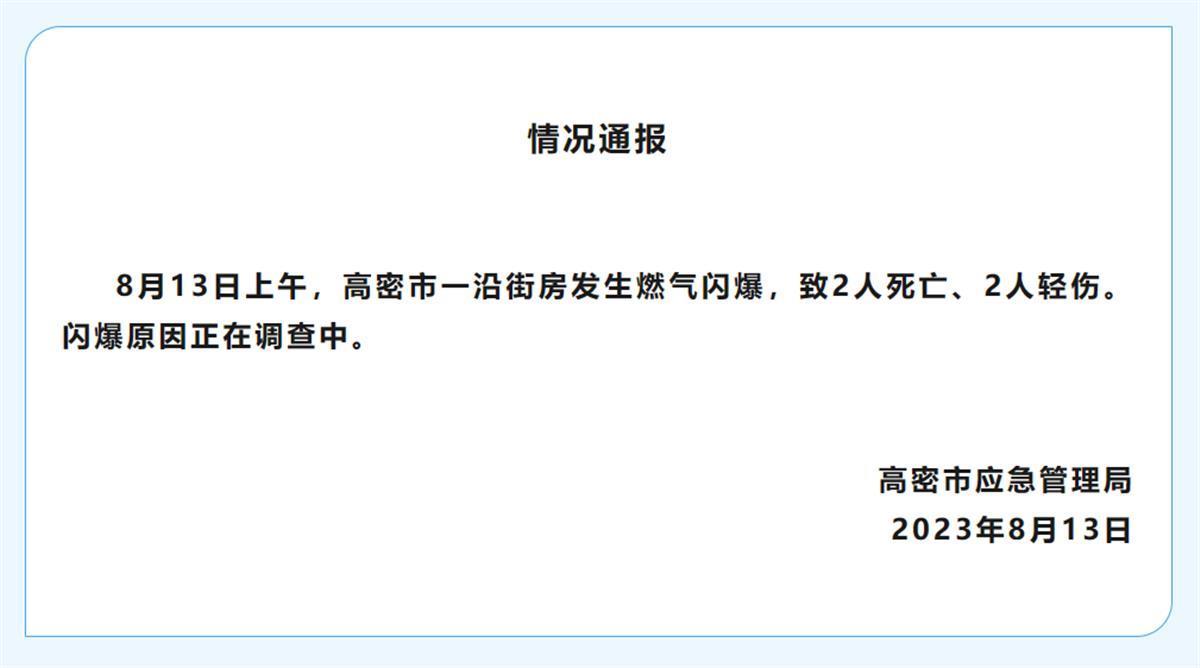 8月13日,山东潍坊高密市一沿街门店发生燃气闪爆,据官方通报,已致2人遇难,2人轻伤。
