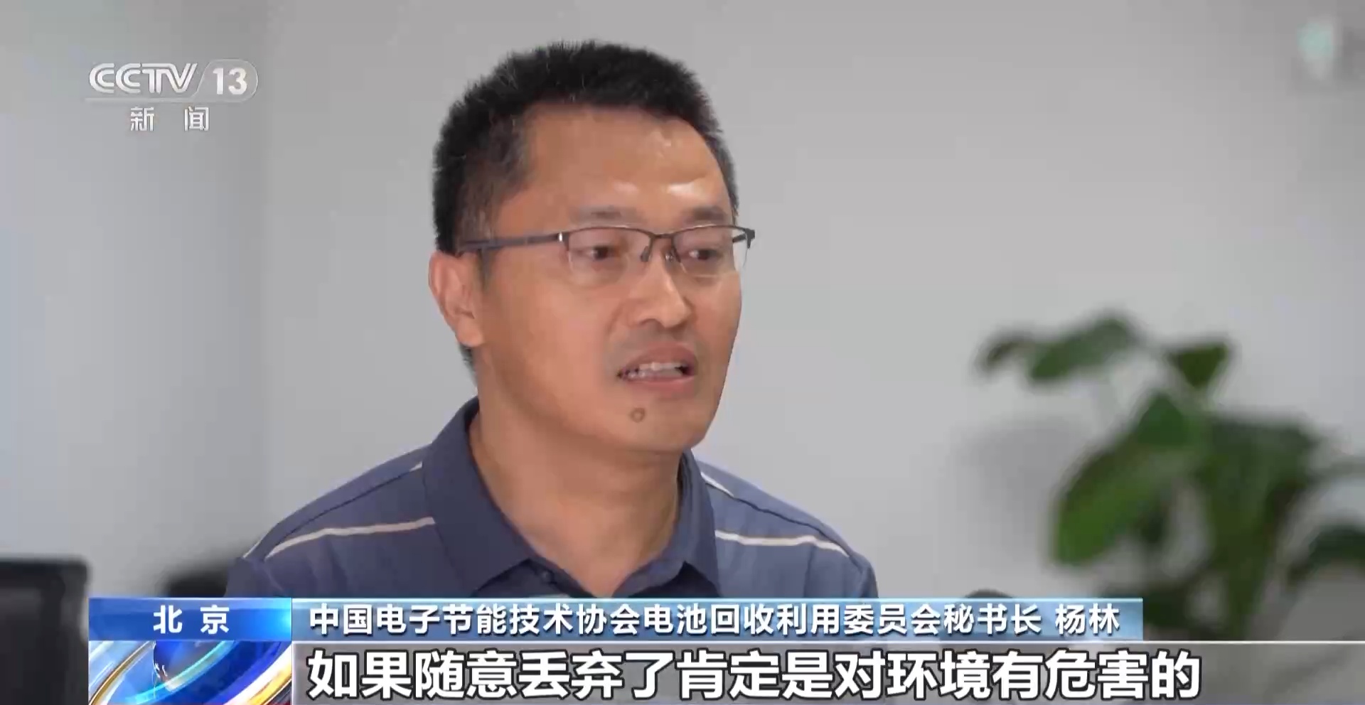 中国电子节能技术协会电池回收利用委员会秘书长 杨林:动力电池里面有一个电解液,还有重金属,如果随意丢弃了肯定是对环境有危害的,这样有可能今后几十年都很难让水土得到一些修复。