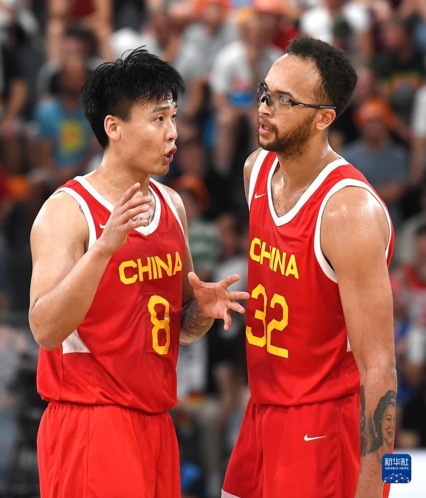 8月13日,中国队球员赵继伟(右)在比赛中与队友崔永熙交流。新华社记者 任鹏飞 摄