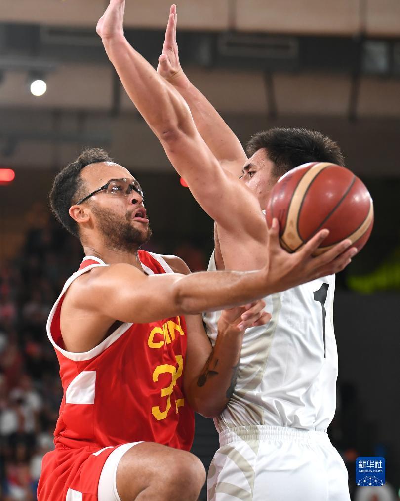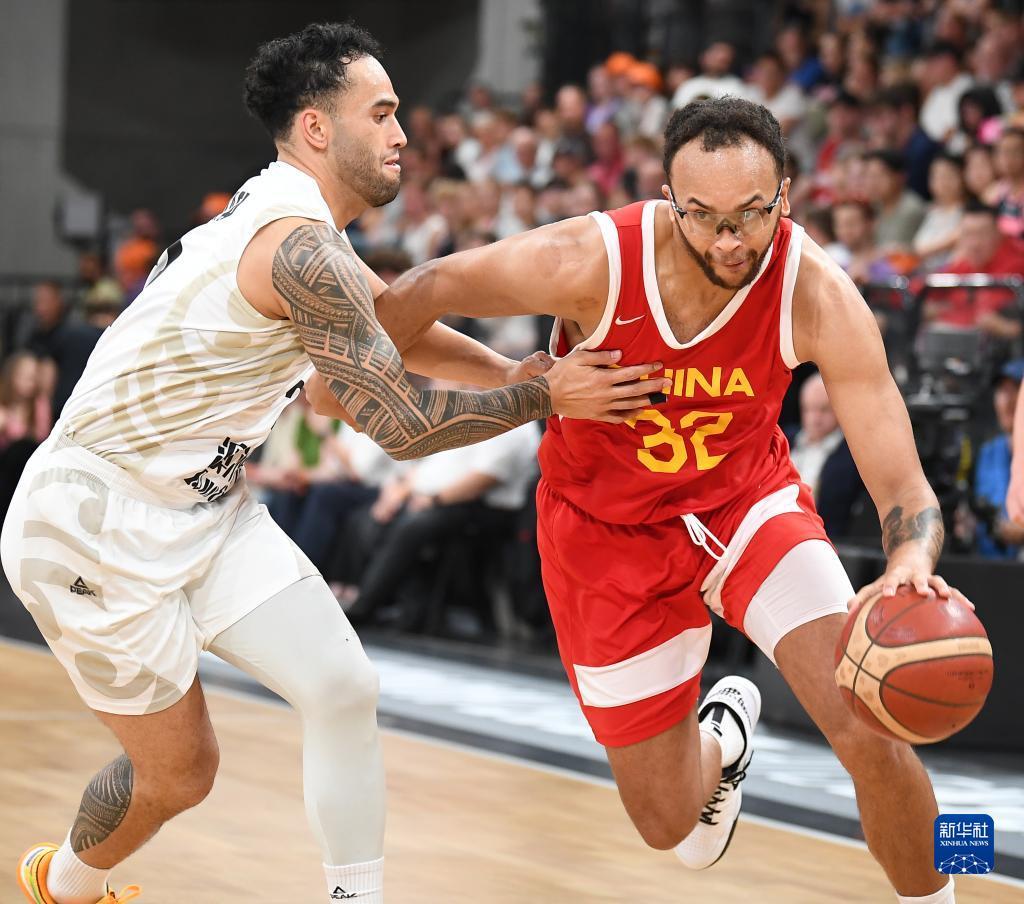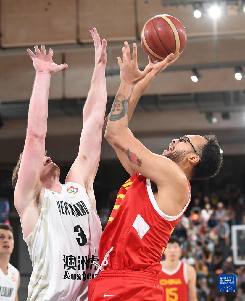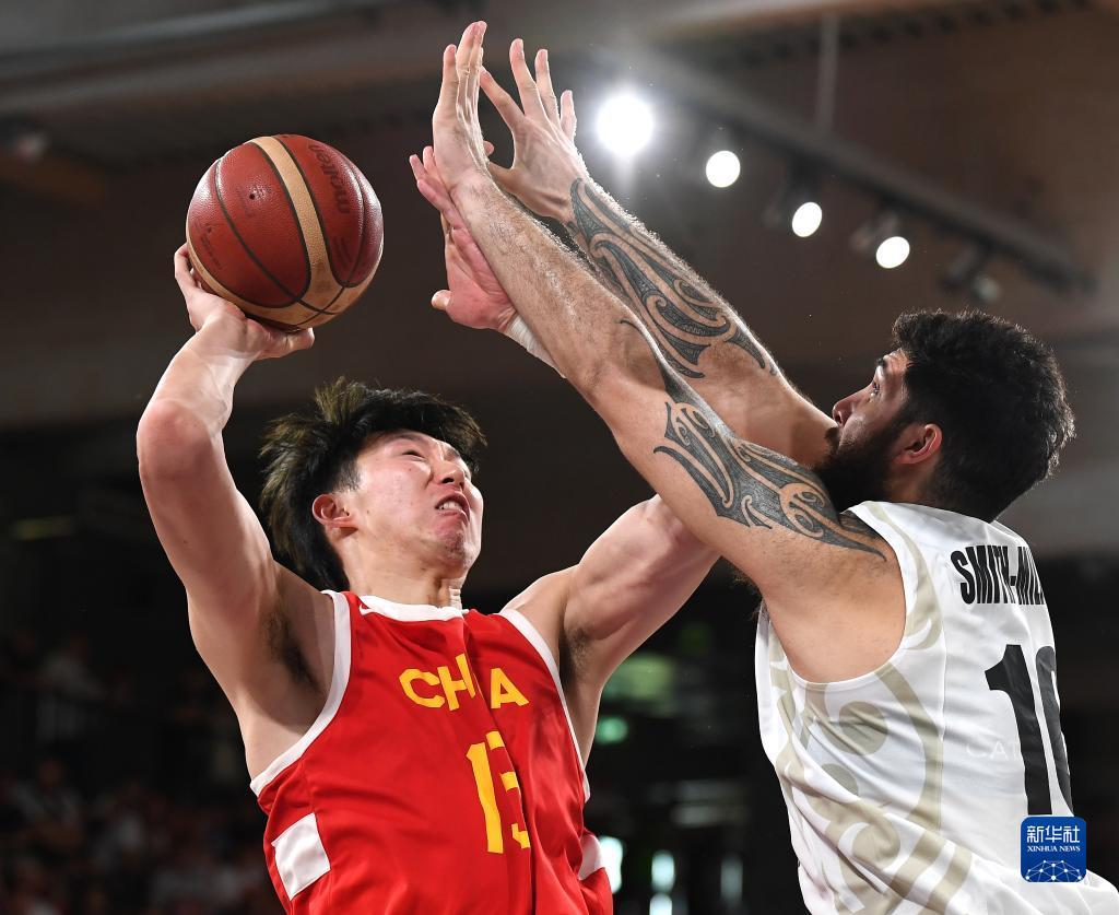 8月13日,中国队球员李凯尔(右)在新西兰队球员德拉尼的防守下投篮。新华社记者 任鹏飞 摄