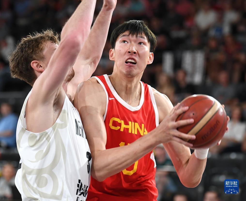 8月13日,中国队球员周琦(左)在新西兰队球员德拉尼的防守下投篮。新华社记者 任鹏飞 摄