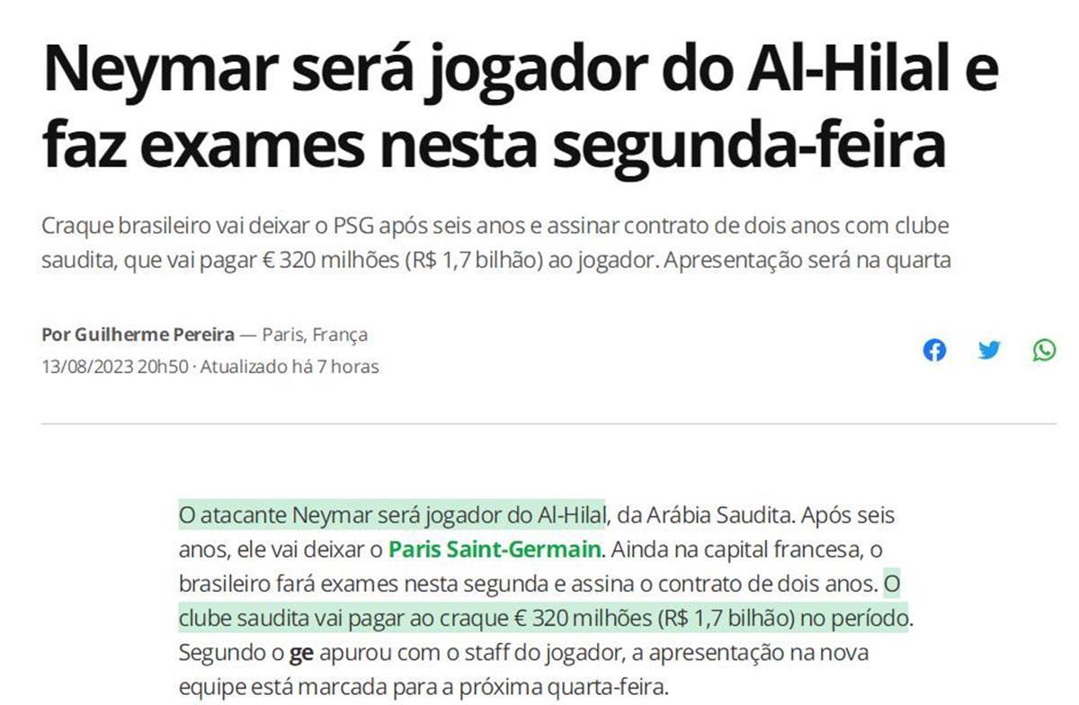 综合巴西媒体globo、意大利记者罗马诺报道,内马尔已经同意加盟沙特联赛球队利雅得新月,合同为两年3.2亿欧元。著名记者罗马诺也证实,利雅得新月正在准备转会文件,而球员本人也同意加入沙特的欧洲淘金大军。这笔交易,可以让大巴黎获得接近1亿欧元的转会费,同时也将卸下这个年薪3000万欧元的大包袱,并为姆巴佩的留队扫清障碍。
