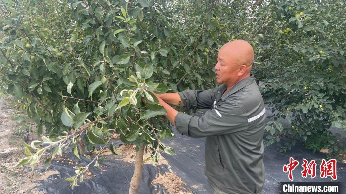 榆岭窊村海红果特色产业示范基地技术员郭连生查看海红果生长情况。杨静摄