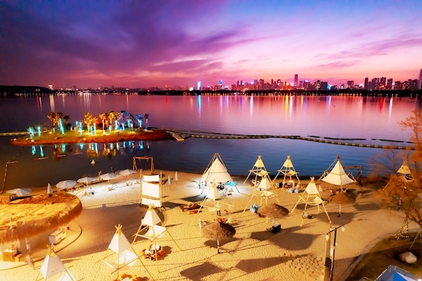 据了解,武汉东湖沙滩风景区推出了丰富的夜游活动。从8月开始,沙滩雕塑小课堂正式开课,游客在专业的雕塑老师指导下,堆出属于自己的沙滩雕塑,还可以体验身体彩绘等项目。躺在临湖竹床上,吃冰镇西瓜,看露天电影,每个周末19时,东湖沙滩落日放映厅浪漫登场。同时,落日影展、多巴胺舞会等活动带给游客别样感受。