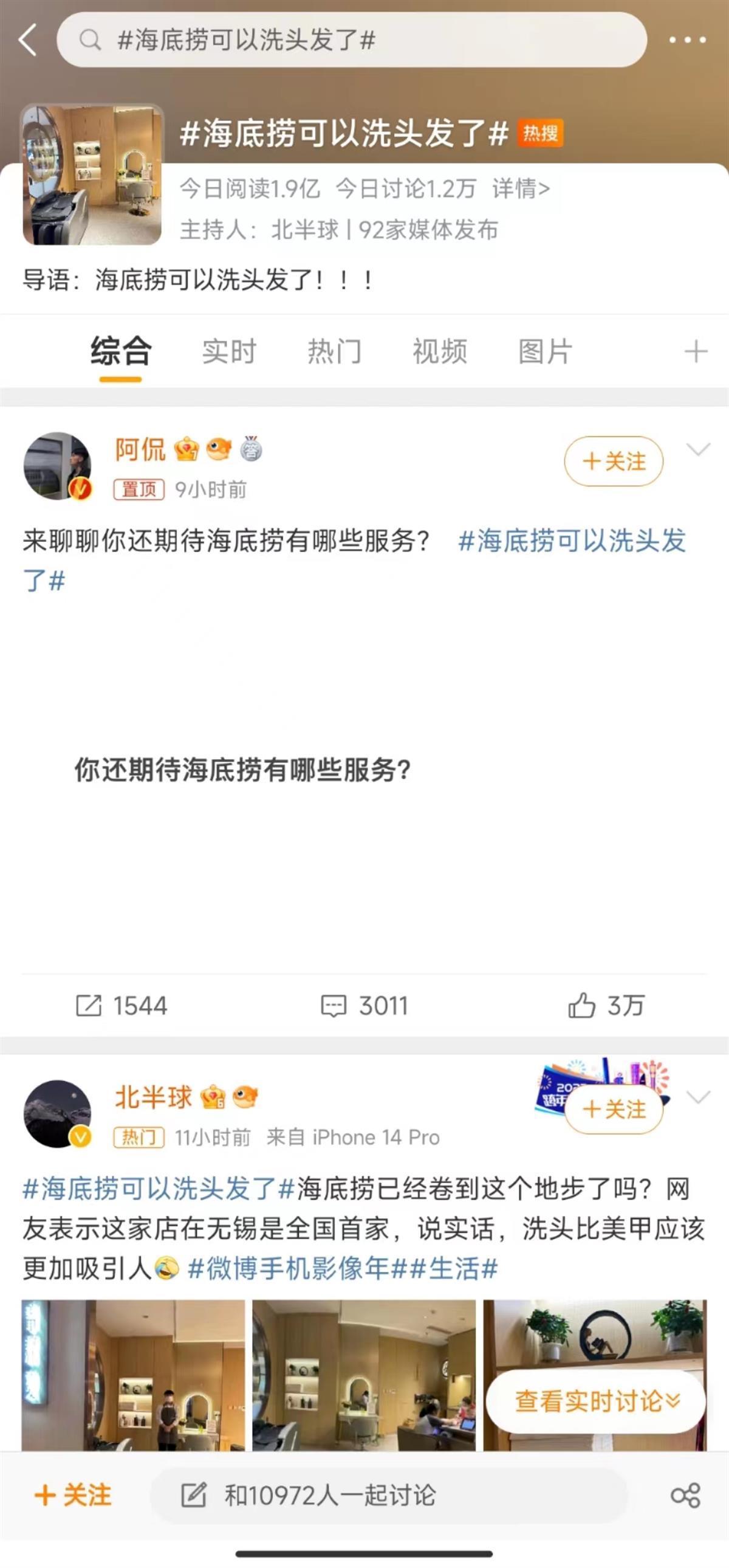 话题#海底捞可以洗头发了#冲上微博热搜榜首(图片来源:微博页面截图)