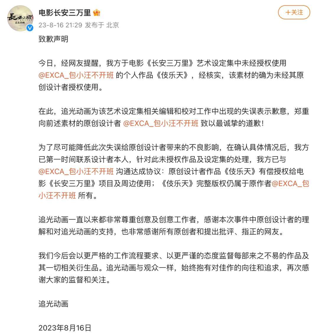 为了尽可能降低此次失误给原创设计者带来的不良影响,在确认具体情况后,我方已第一时间联系设计者本人,针对此未授权作品及设定集的处理,我方已与“EXCA_包小汪不开班”沟通达成协议:原创设计者作品《伎乐天》有偿授权给电影《长安三万里》项目及周边使用;《伎乐天》完整版权仍属于原作者“EXCA_包小汪不开班”所有。