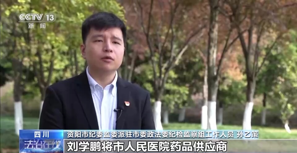 资阳市纪委监委派驻市委政法委纪检监察组工作人员 孙乙策:在这次所谓的改革中,刘学鹏将市人民医院药品供应商从最多时候的200余家,压缩到与其有利益关联的7家,并最终缩减至5家。医院药品购销利益格局被打破重构。