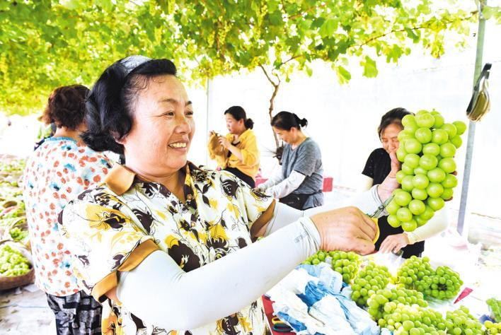 8月3日,公安县埠河镇科润现代农业合作社,100多名社员抓紧进行葡萄采摘、分装、储运。该合作社每天采摘量超15吨,主要销往北京、福建等地。 今年公安县11万亩葡萄大面积丰收,埠河镇占全县葡萄种植的半壁江山。 (视界网 叶力铭 梅闻 摄)