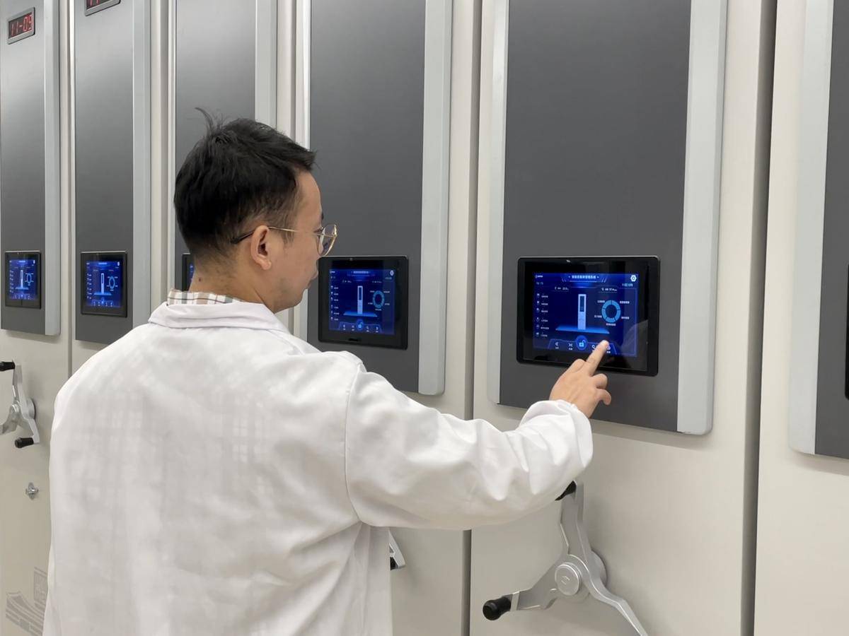 湖北省档案馆工作人员操作档案智能密集架。