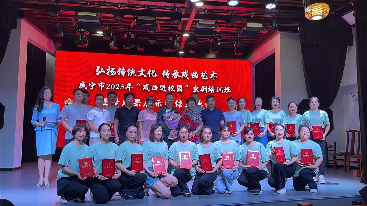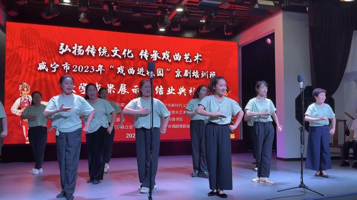 8月18日上午,咸宁市2023年“戏曲进校园”京剧培训班教学成果展示暨结业典礼,在咸宁市群众艺术馆举行。伴随着传统戏曲音乐,来自咸宁下辖各县市区的骨干音乐教师及文艺工作者们,给现场观众献上了一场精彩绝伦的视听盛宴。