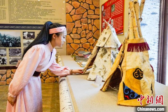 身穿鄂伦春民族服饰的女孩在观赏桦树皮制作的迷你“撮罗子”。赵宇航 摄