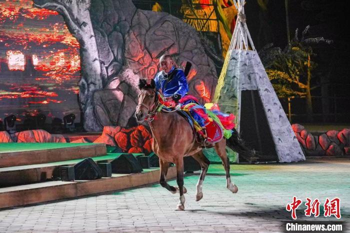 鄂伦春族人表演骑马狩猎场景,身后是桦树皮制作的“撮罗子”。赵宇航 摄