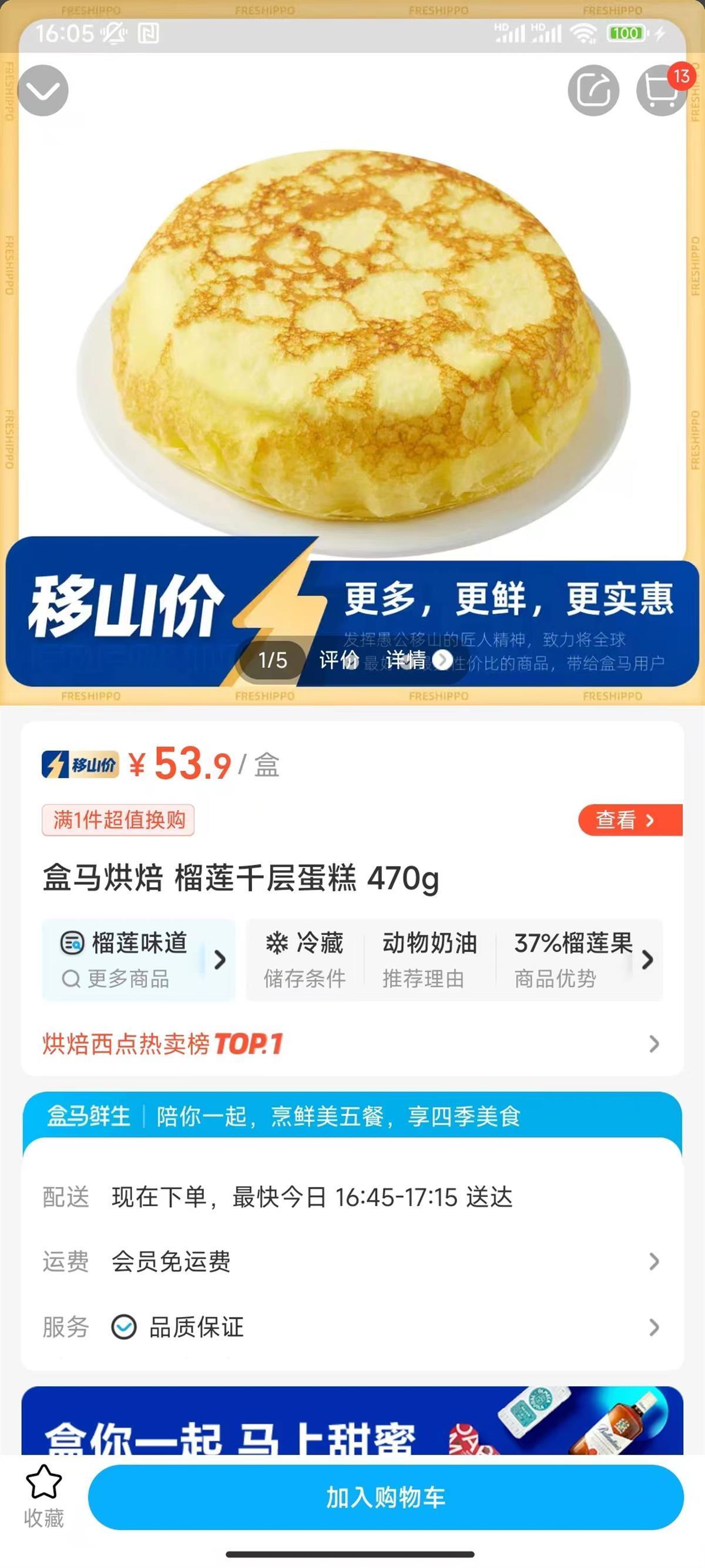 21日中午,记者在武汉市武昌区东湖路打开盒马App,榴莲千层蛋糕已更新了“移山价”,470克的价格为53.9元。此前,该产品价格为69.9元,便宜了16元。
