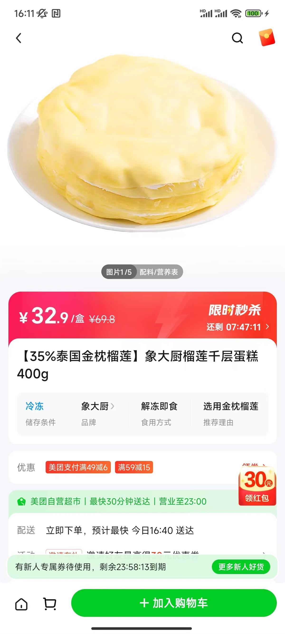 而美团买菜的价格已经降到了32.9元,规格为35%泰国金枕榴莲的象大厨榴莲千层蛋糕400克。