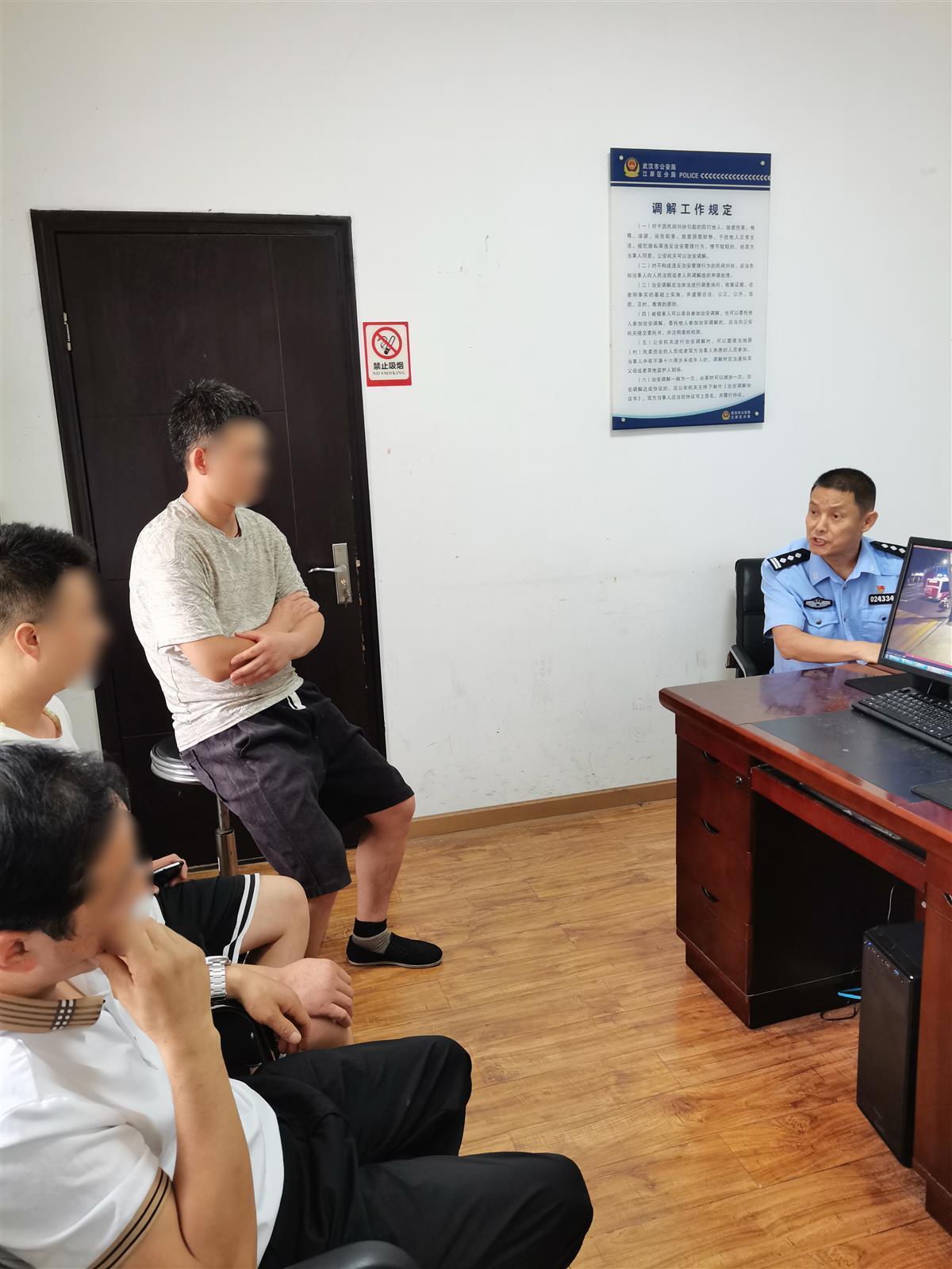 黄汉中的办公室也是花桥街派出所调解室,位于派出所一楼,紧挨着大厅。记者采访时发现,只要大厅里传来大声说话的声音,黄汉中就去看看动静。这不,一名居民在大厅里说话声音大了一点,黄汉中赶紧去查看,得知居民想反映施工噪音扰民问题,黄汉中告诉他去街道综合执法中心反映。