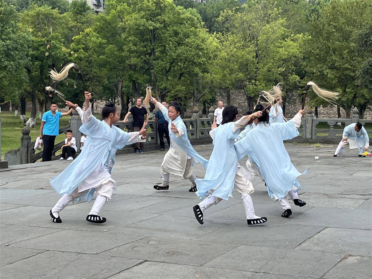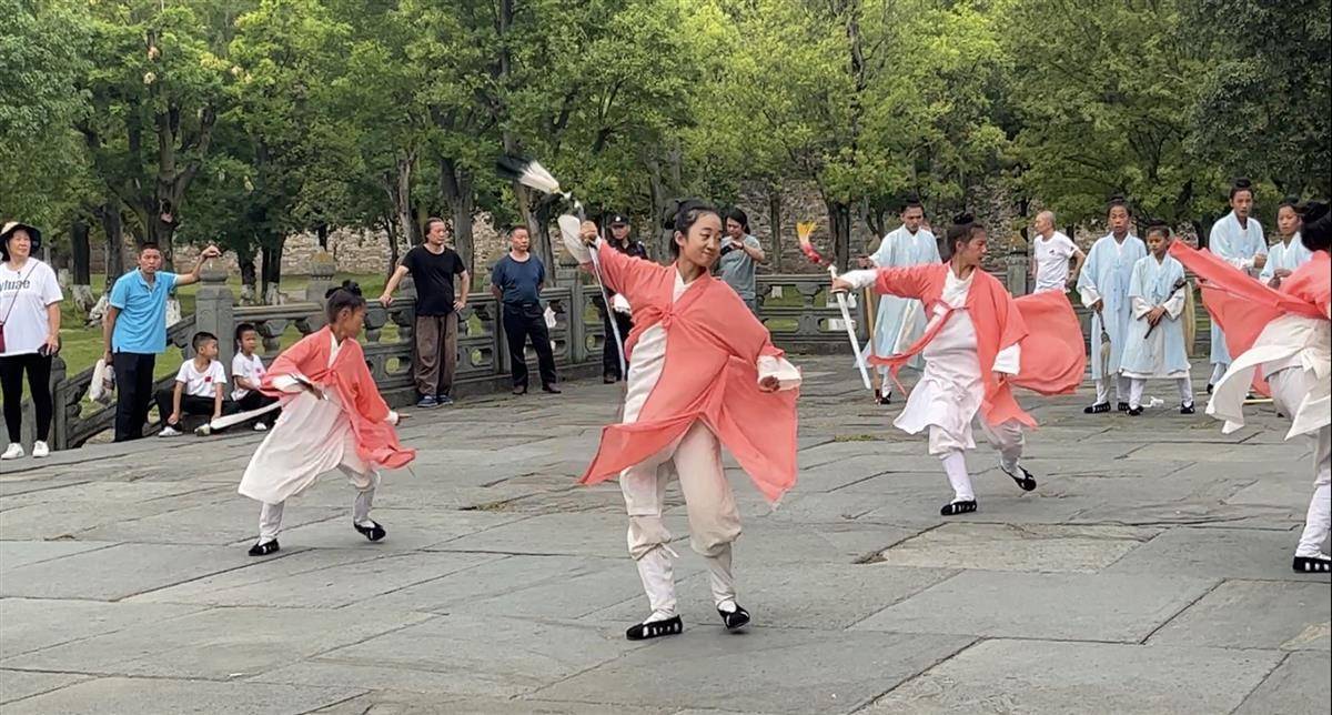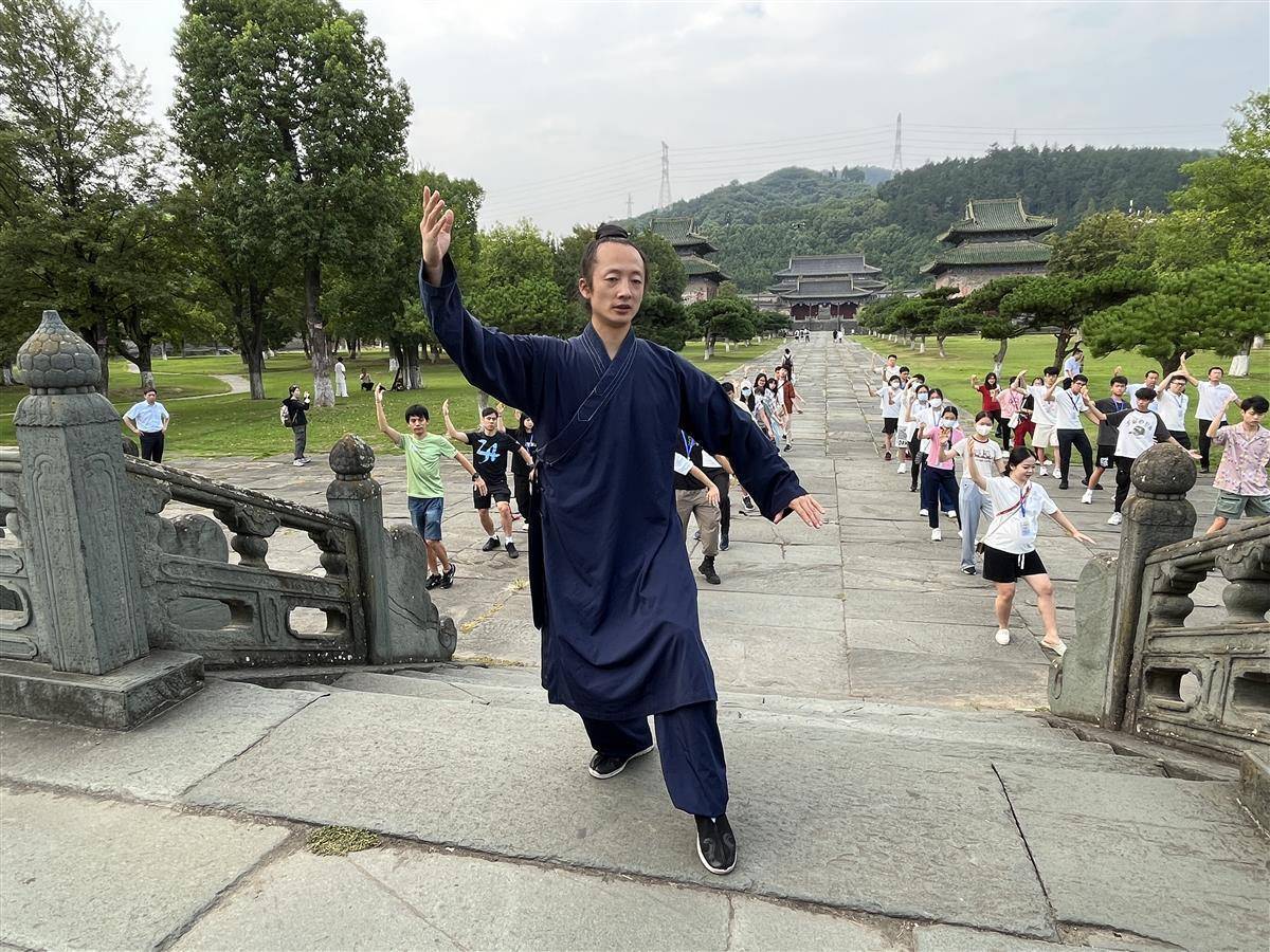 8月18日,“青春同心共‘荆’彩——知行湖北”香港香港大中学生研学交流团走进湖北省十堰市武当山风景区,在玉虚宫欣赏武当传统武术,学习太极传统拳法,在武当山千峰万仞间感受祖国河山的奇美秀丽。