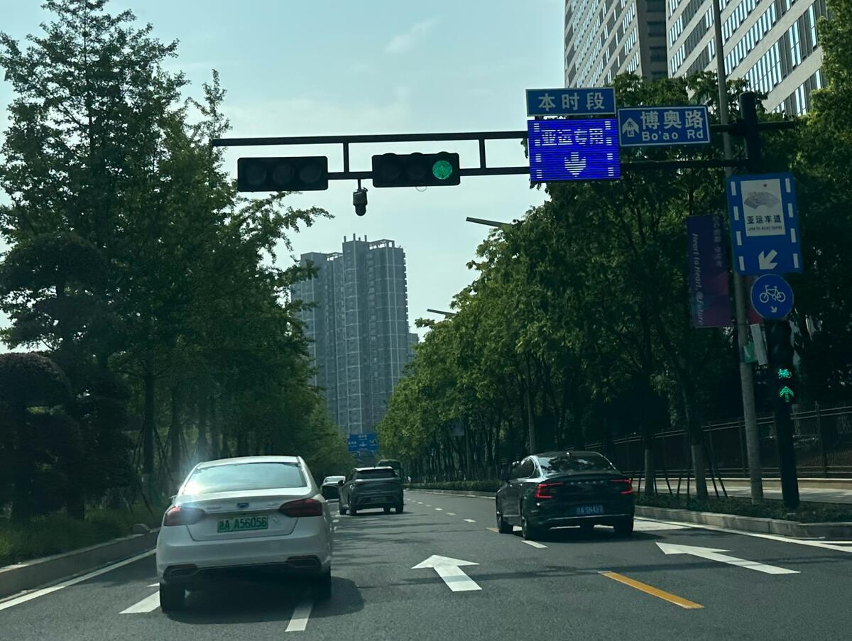 秩序井然的同时也有一些“小插曲”。8时40分左右,博奥路上的亚运数字专用车道显示“本时段亚运专用”,记者看到有几辆私家车依旧行驶在亚运车道上,有车牌号为外地的车辆,也有个别本地车辆。执勤交警会向司机挥手示意换道,遇到一直没有驶离亚运车道的车辆,交警则挥手拦停,摇下车窗对车主进行解释。