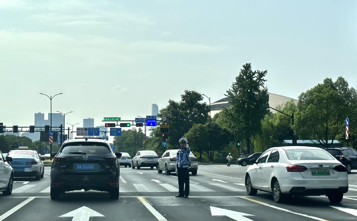 交警在路口指挥社会车辆往两侧道路行驶 浙江在线 记者 李心怡 摄